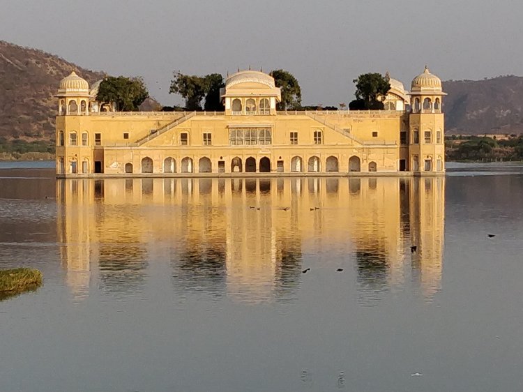 A palace in the middle of ” mansagar lake ” Jaipur. Beautiful view of sunset along with the reflection of Mahal .