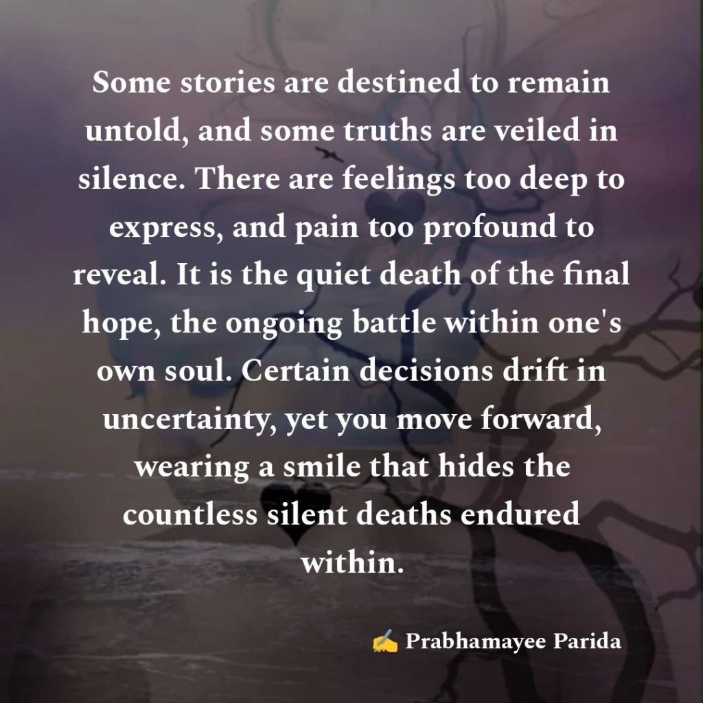 Some stories are destined to remain untold, and some truths are veiled in silence. There are feelings too deep to express, and pain too profound to reveal. It is the quiet death of the final hope, the ongoing battle within one’s own soul. Certain decisions drift in uncertainty, yet you move forward, wearing a smile that hides the countless silent deaths endured within.